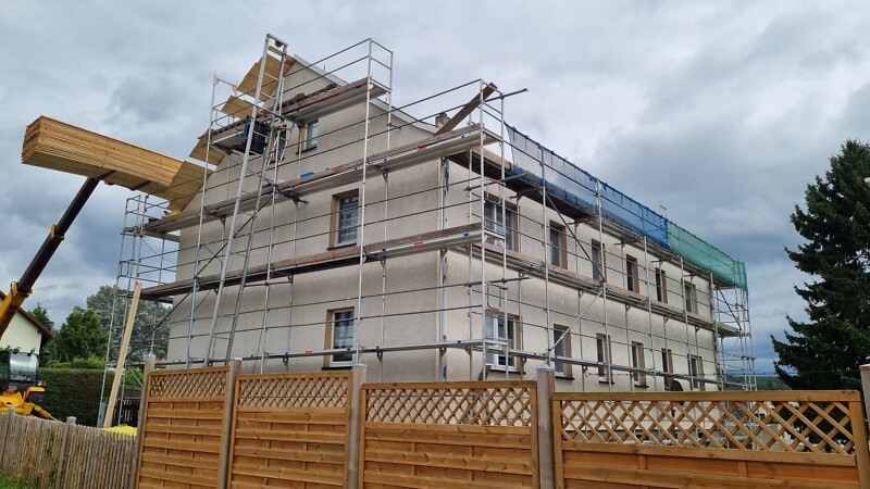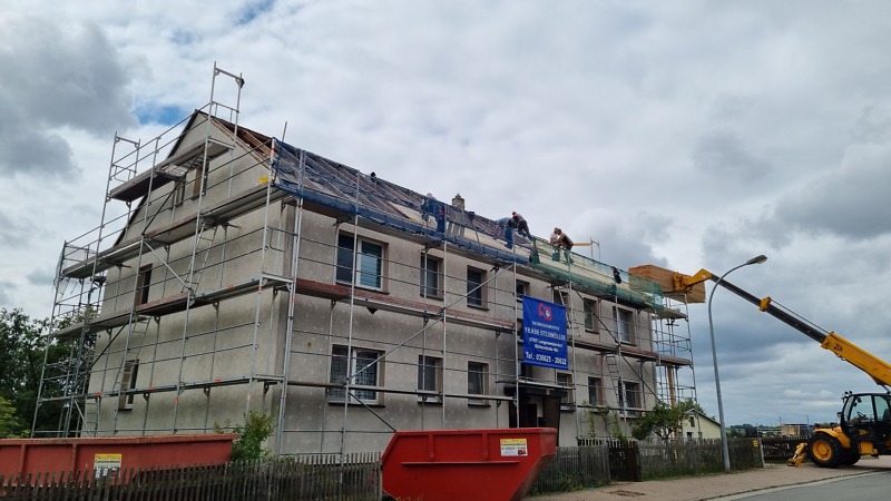 In der Genossenschaftsstraße 9 in 07957 Langenwetzendorf wurde diese Woche mit der Erneuerung des Daches begonnen. Im Anschluss daran erhält die Fassade noch einen neuen Anstrich. Erforderliche Putzarbeiten werden gleich mit erledigt.