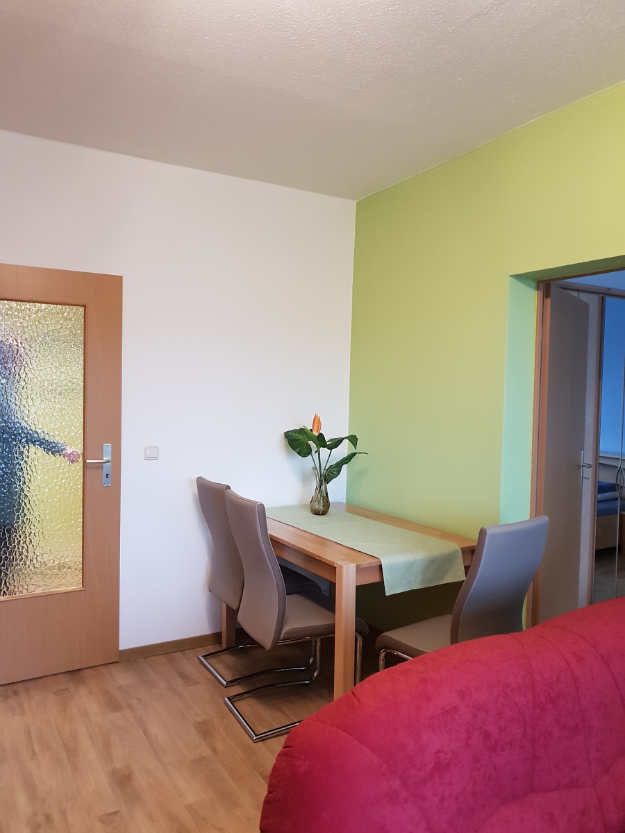 Maritimes Schlafzimmer trifft gemütliches Wohnzimmer mit viel Platz und einem Balkon. Die Wohnung ist komplett ausgestattet mit Einbauküche, Dusche/WC, Wohnzimmer mit Essecke und Couch, Telefon und Internetanschluss sowie Schlafzimmer . Die Wohnung mit Wohlfühlchararakter und Zuhause-Gefühl bietet so gut wie alles, was Sie für einen Aufenthalt in Greiz benötigen. In unserer gemütlichen Gästewohnung finden bis zu zwei Personen Platz.